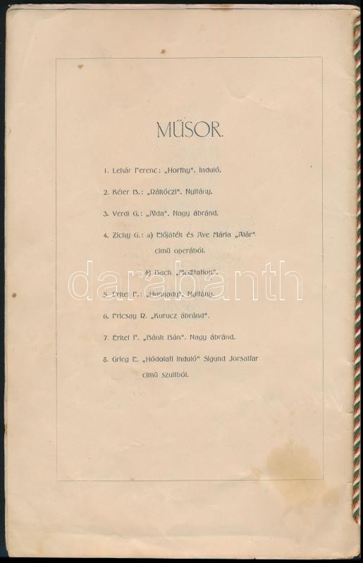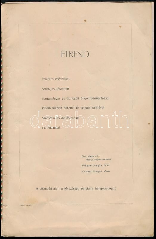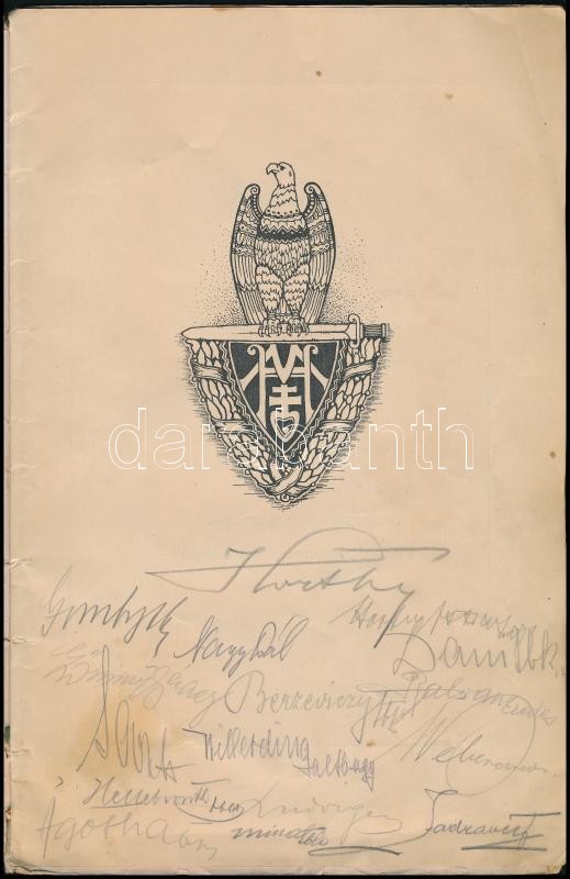 1920 "Díszebéd Horthy Miklós Magyarország kormányzójának tiszteletére 1920. III. 7., a Fővezérség tisztikara", érkeserűi Balogh Barna (?-?) ezredes, dandárparancsnok részére dedikált műsoros étlap az első és az utolsó oldalon Horthy Miklós, Horthy István és a fővezérkar más tagjainak aláírásaival: Hellebrandt János, Dáni Balázs, Létay Gyula, Berzeviczy Béla, Ferjentsik Ottó, Ráskay László, Sipos Árpád, Ambrózy György, Nagy Pál, Willerding Rezső, Zadravecz István, Ujhelyi Péter, stb., kicsit foltos