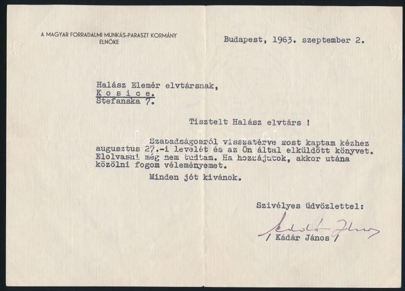1963 Kádár János gépelt köszönőlevele, Kádár aláírásával, borítékban https://www.darabanth.com/de/28-Gross-Auktion/28.1/Andere-Sammelgebiete/Historische-Dokumenten-Handschriften~11297/1963-Kadar-Janos-gepelt-koszonolevele-Kadar-alairasaval-boritekban~II1642868
