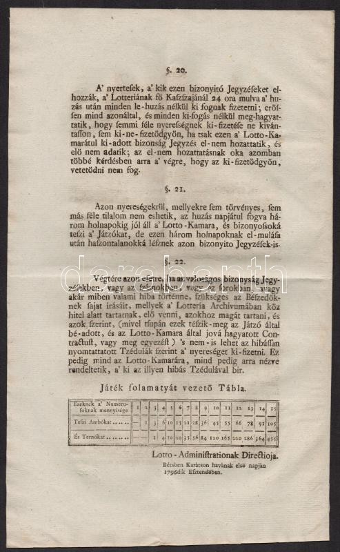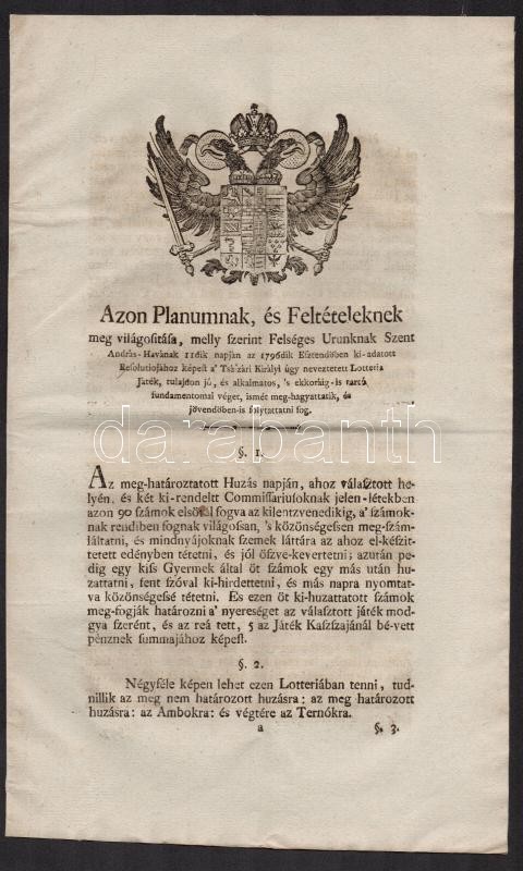 VÉDÉS ALATT! 1796 Azon Planumnak, és Feltételeknek meg világosítása, melly szerint Felséges Urunknak Szent András-Havának 11dik napján az 1796dik Esztendőben ki-adatott Resolutiojához képest a' Tsászári Királyi úgy nevezett Lotteria Játék, tulajdon jó, és alkalmatos, 's ekkoráig-is tartó fundamentomai véget, ismét meg-hagyattatik, és jövendőben-is folytattatni fog. Bécs, Lotto Administrationak Directioja, 6 sztl. lev.
