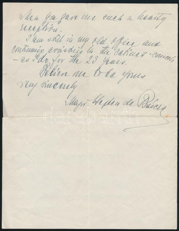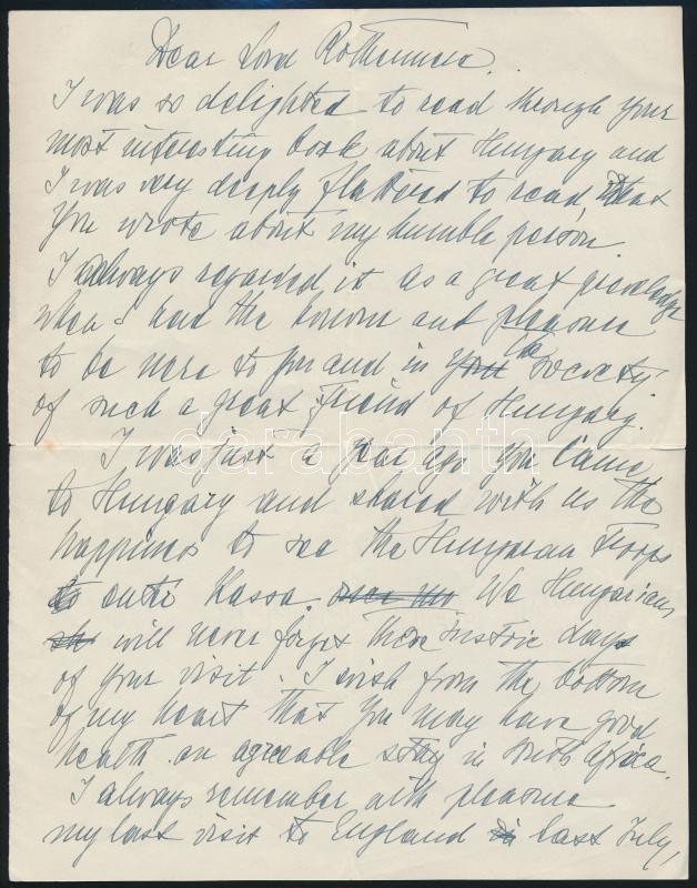 cca 1925 Bárcziházi Bárczy István (1882-1952) államtitkár autográf levele lord Rothermere, magyar revízió támogatójának a Daily Mail tulajdonosának személyes hangvételben. A levélben megköszöni, amit Magyarországért tesz. Két beírt oldal