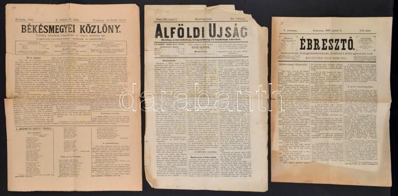 1882-1883 Vegyes Békés megyei lapok, 3 db: 1882 Ébresztő. Társadalmi, ipar, kereskedelmi, tanügyi s közgazdasági lap. V. évf. 3. sz., 1882. január 15. Szerk.: Dr. Tolle. Debrecen, Takács Ferenc, szakadozott, 4 sztl. lev. 1882 Alföldi Újság. Hetilap, a társadalom, közgazdaság és irodalom köréből. I. évf. 1. szám, mutatványszám. Szerk.: Sipos Sándor. Békés, Alföldi Újság Könyvnyomdája-ny., Alföldi Újság Könyvnyomdájának reklámjával, szakadt,hiányos, 4 sztl. lev. 1883 Békésmegyei közlöny. Politikai, társadalmi, közgazdászati és vegyes tartalmu lap. X. évf. 83. sz.,1883. október 14.-én. Békéscsaba, Povázsay László-ny., korabeli reklámokkal, szakadozott, 4. sztl. lev.