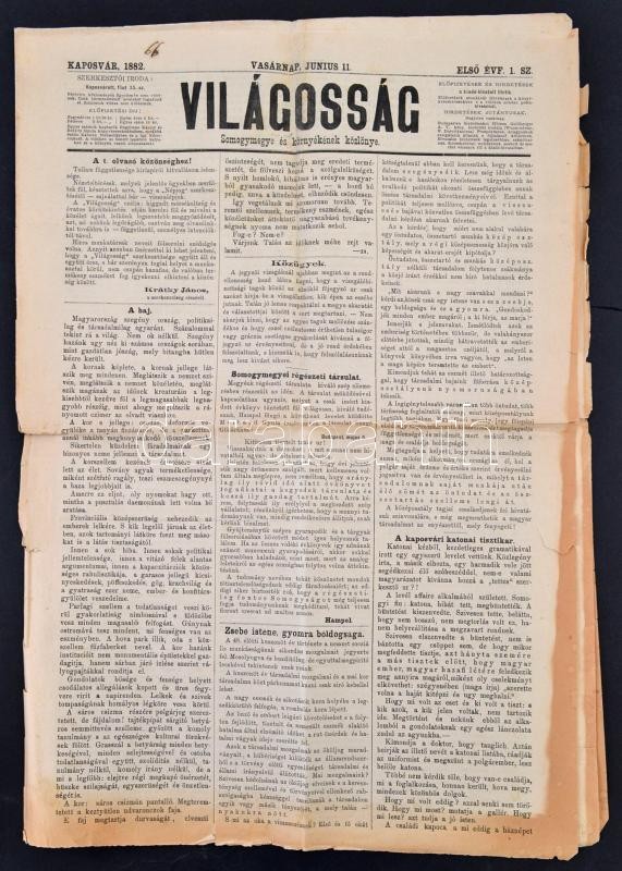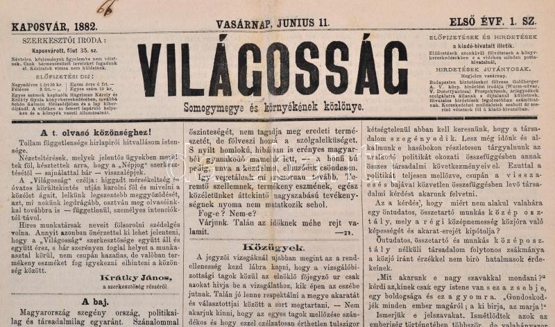 1882 Világosság. Somogymegye és környékének közlönye. I. évf. 1. sz., 1882. junius 11. Szerk.: Krátky János. Kaposvár, Jeiteles Hermann-ny., korabeli reklámokkal, az egyik lap széle szakadozott, foltos, 8 p. Rövid életű somogyi hírlap, 1882-1883 között jelent meg Krátky János szerkesztésében.