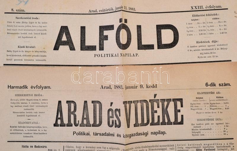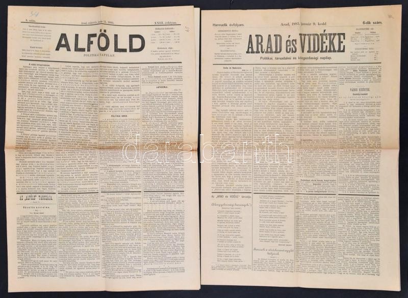 1883 Vegyes Arad megyei lapok, 2 db: Arad és Vidéke. Politikai, társadalmi és közgazdasági napilap. III. évf. 6. sz., 1883. január 9. Szerk.: Sümegi Kálmán. Arad, Gyulai István-ny., korabeli reklámokkal, jó állapotban, 4 sztl. lev. A folyóirat 1880-1922 között jelent meg Aradon. Polgári liberális vonalat képviselő folyóirat volt, amely terjedelme alapján Erdély legjobb lapja között tartottak számon. Alföld. Politikai napilap. XXIII. évf. 8. sz., 1883. január. 11. (Szerk.: Vörös József.) Arad, Réthy Lipót és fia-ny., korabeli reklámokkal, jó állapotban, 4. sztl. lev. A lap kezdetben a Deák-párt álláspontján volt, majd a balközép álláspontját fogadta el. A kor népszerű lapja volt, országos jelentőségre jutó, politikailag és eszmeileg számottevő hírlap volt. A kiadó kezdetben Bettelheim Vilmos, majd Réthy Lipót és fia volt.