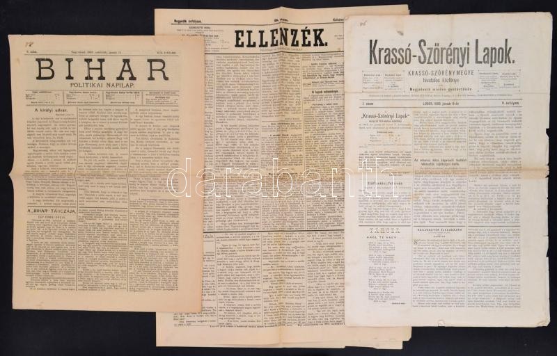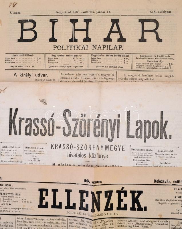 1883 Vegyes erdélyi lapok, 3 db: Ellenzék. Politikai és társadalmi napilap. Kolozsvár. IV. évf. 26. sz.,1883. február 1. (Szerk.: Bartha Miklós.) Kolozsvár, Magyary Mihály-ny.,korabeli reklámokkal, jó állapotban, 4. sztl. lev. Az Ellenzék kolozsvári politikai és társadalmi napilap volt. 1878-ban alapította Bartha Miklós, 1880-1944-ig jelent meg. Bihar. Politikai napilap. XIX. évf. 8 sz., 1883. január 11. Nagyvárad, Hollósy Jenő-ny., Hollósy Jenő könyvnyomdájának egészoldalas reklámjával, kis szakadással, 4. sztl. lev. A biharmegyei gazdasági egylet közlönye. Krassó-Szörényi Lapok. Krassó-Szörény Megye hivatalos közlönye. V. évf. 1. sz, 1883. január 6. Lugos, Wenczely János és fia-ny., korabeli reklámokkal, 4 sztl. lev. Lugoson, politikai hetilapként indult Virányi János nyomdász alapításában, 1878-1939 között jelent meg.