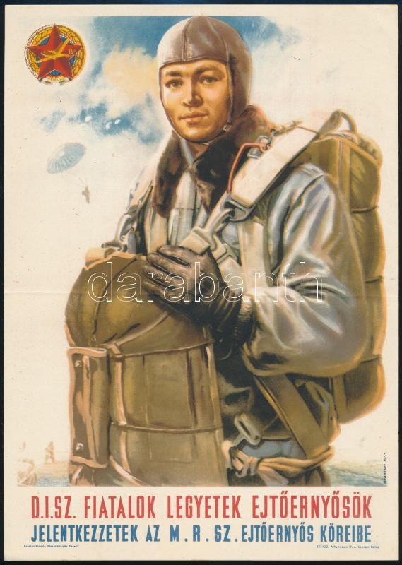 1953 Bánhegyi Tibor (1923-): DISZ fiatalok legyetek ejtőernyősök, kism... https://www.darabanth.com/de/28-Gross-Auktion/28.1/Andere-Sammelgebiete/Poster~11192/1953-Banhegyi-Tibor-1923-DISZ-fiatalok-legyetek-ejtoernyosok-kismeretu-plakat-24C39717-cm~II1680834