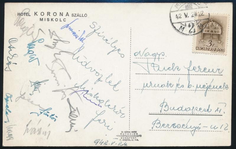 Beschreibung: 1942 Az FTC játékosainak (Polgár, Rudas, Sárosi, stb.) aláírásai Miskolcról küldött levelezőlapon