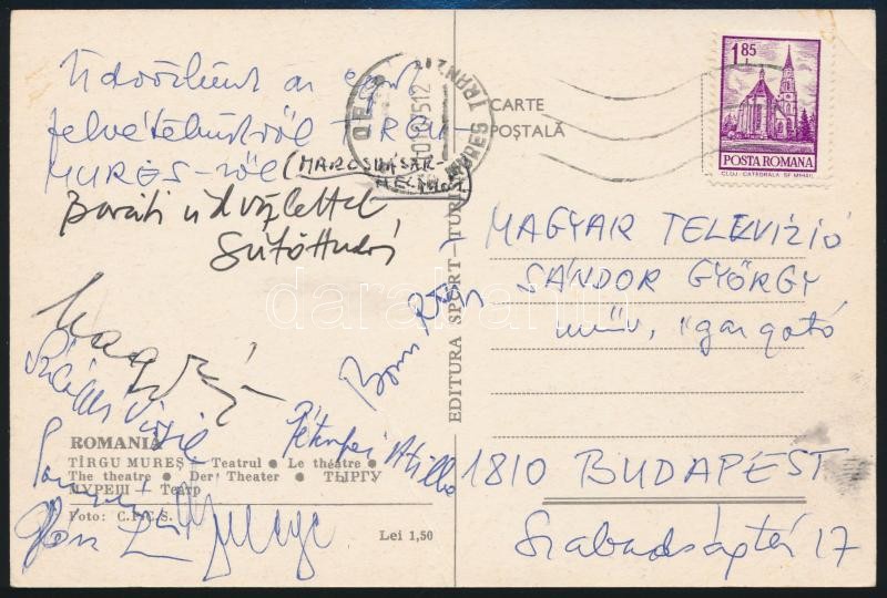 Beschreibung: 1975 Sütő András író és mások aláírásai Marosvásárhelyről Sándor György, a Magyar Televízió művészeti igazgatójának küldött levelezőlapon