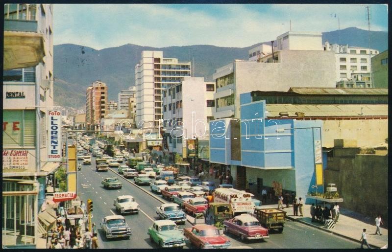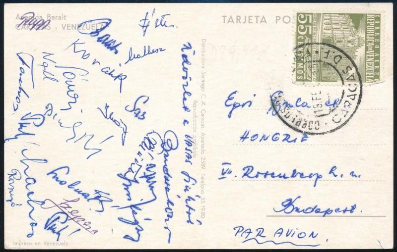A Vasas labdarúgócsapat tagjai által aláírt képeslap Venezuelából. (Rupp, Sas, Rozsnyó, Molnár, Szepesi / Autograph signed postcard of Hungarian football team.