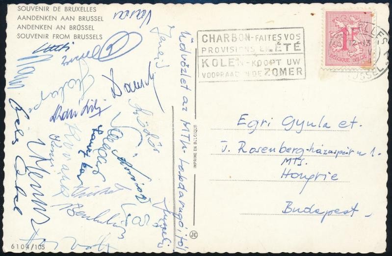 A z MTK labdarúgócsapat tagjai által aláírt képeslap Brüsszelből. (Jenei, Gödör, Vasai, Lanzkar, Kovalik... / Autograph signed postcard of Hungarian football team.
