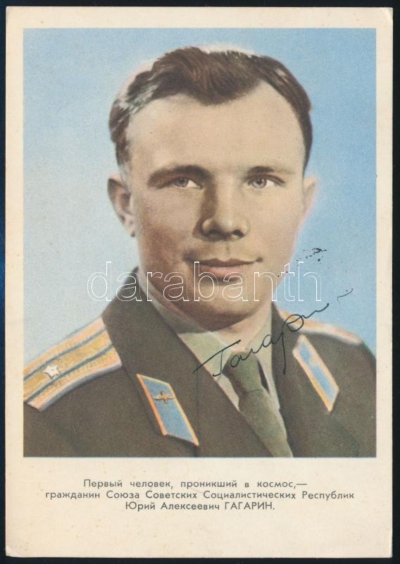 Jurij Alekszejevics Gagarin (1934-1968) szovjet űrhajós aláírása őt magát ábrázoló fotólapon /