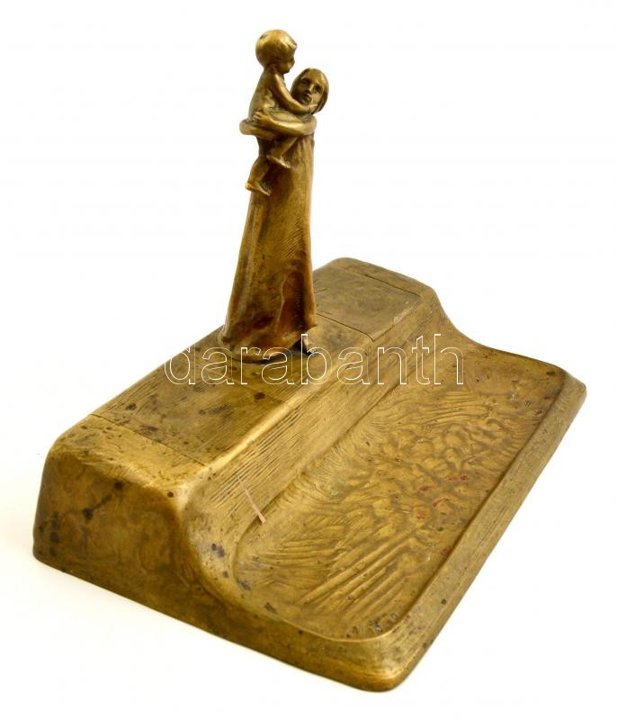 Peter Tereszczuk (1875-1963) Figurális aranyozott bronz asztali toll- és tintatartó, Anya kisgyermekével, Két üvegbetéttel. Egyik pótolt, másikon lepattanás. Jelzett bécsi bronz munka, Artur Rubinstein öntőjegyével. /