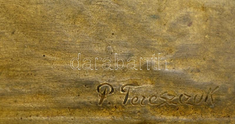 Peter Tereszczuk (1875-1963): Figural bronze pen holder. Signed. With 2 glass trays. One is added, the other has a crack. 28x22 cm