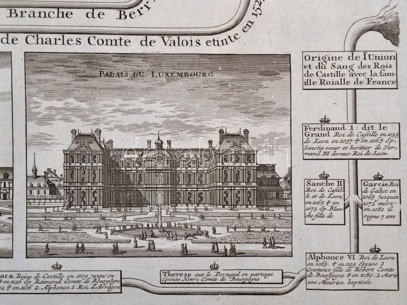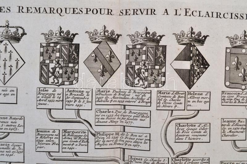 cca 1750 A Valois uralkodócsaád ls a Berri csaád családfája, ksatélyok és családi címerek képeivel. Rézmetszet. / Large etching of the family tree of the Valois and Berri family. 56x44 cm
