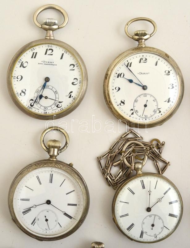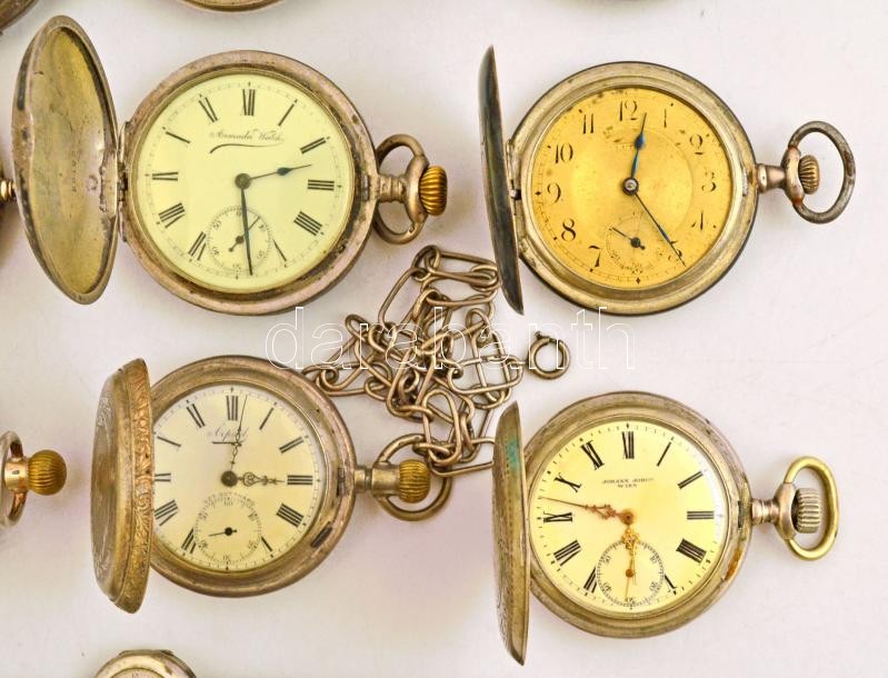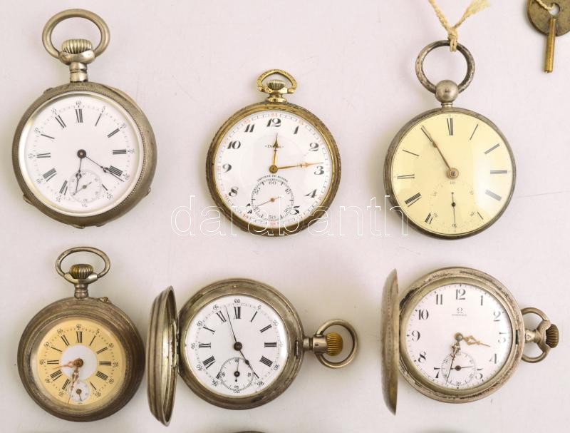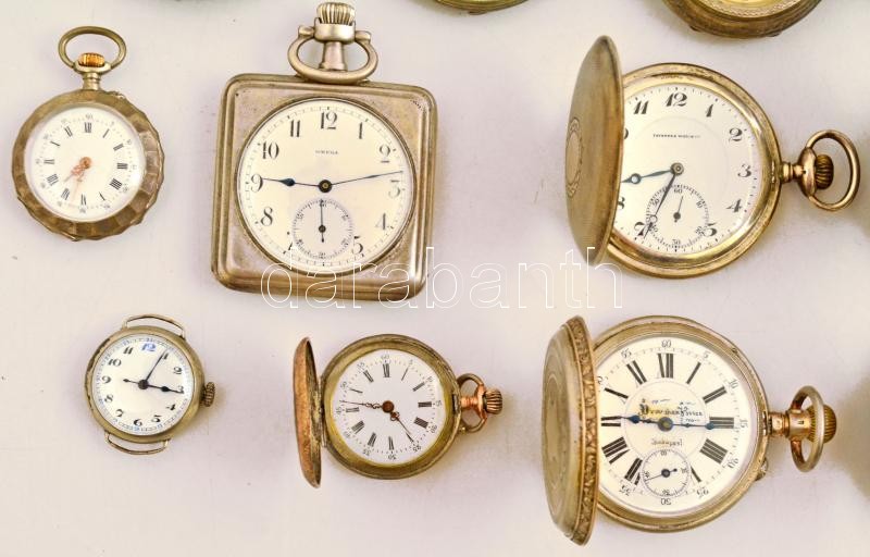 22 darabos ezüst óra-gyűjtemény. Ezüst zsebórák és karórák. Doxa, Omega, Tavannes, magyar órások gyártmányai, kulcsos zsebórák. Mind szép, működő állapotban. Szép számlapokkal, hibátlan üvegekkel. / 22 silver pocket and hand watches. All in nice, functional condition.