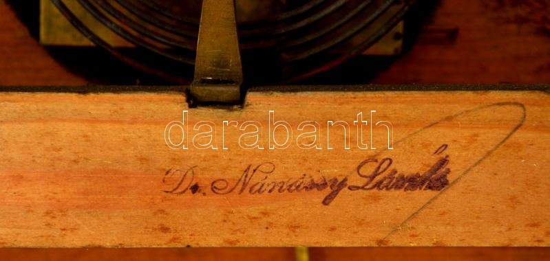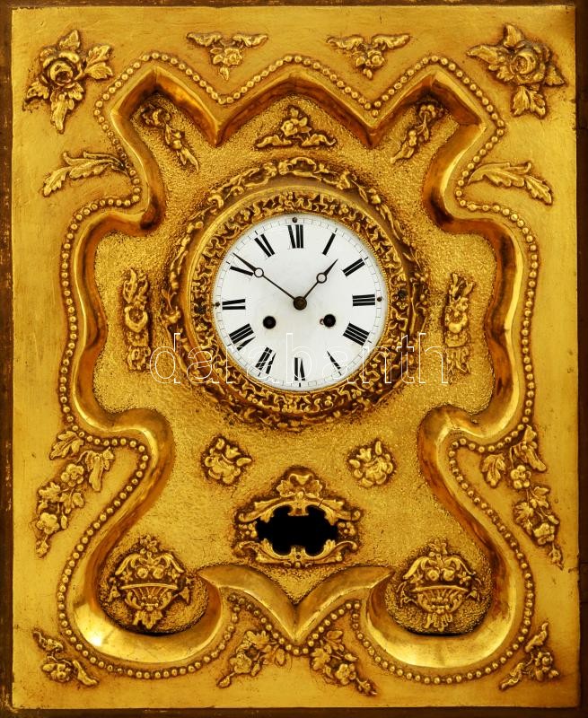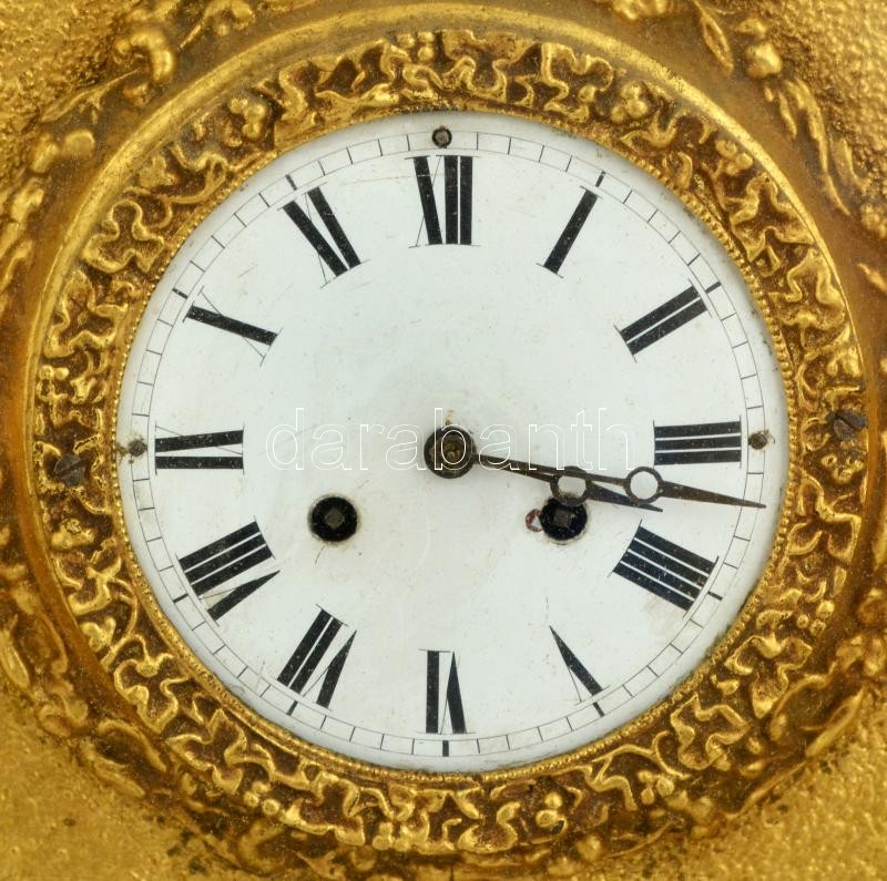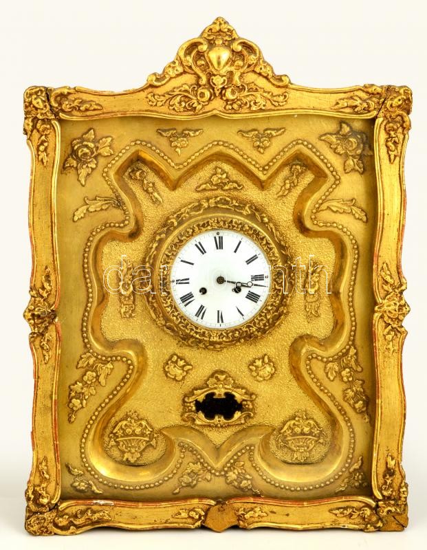 XIX. sz eleje: Biedermeier naptáras keretóra, ingás szerkezettel negyed ütős, felhúzókulcs nélkül, . Javításra szorul. Hibátlan zománc számlappal, jó állapotú aranyozott fa részekkel. / Begining of the XIXth century: Biedermeier antique frame clock, with original mechanics, without winder. Needs repair. 42x49 cm