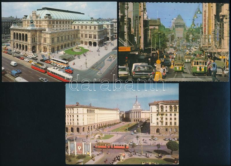 Beschreibung: Sárga, zöld, piros villamosok külföldön, 1 db vintage fotó (6x9 cm) + 4 db képeslap (Nagyvárad, Szófia, Melbourne, Bécs) villamos motívummal