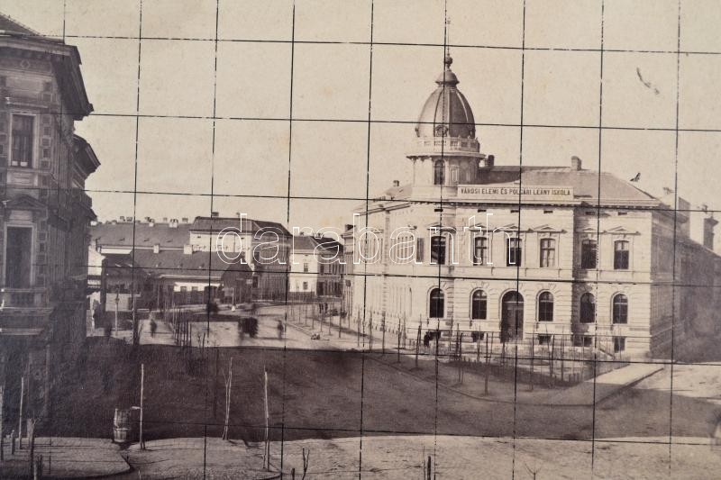 cca 1895 Szeged, Dugonics tér, Tisza Lajos körút találkozása, jobbra szemben a Feketesas utca, a fotón a Városi Elemi és Polgári Leány Iskola épületével (ma Jogi kar főépülete), és a hírös Vendéglő a Vademberhez korcsmával, nyomdai munkára való előkészítéssel, 32x27 cm.