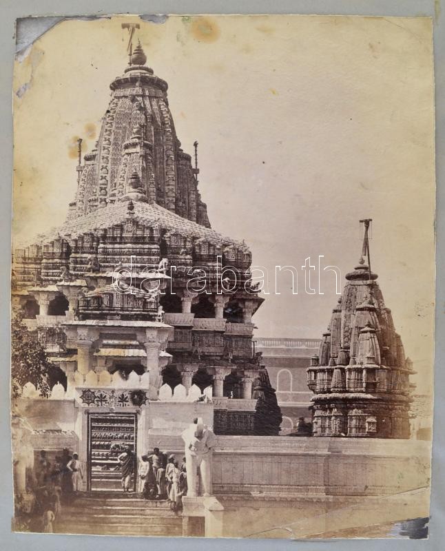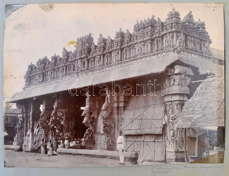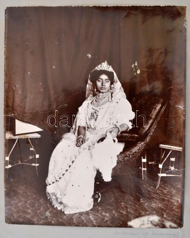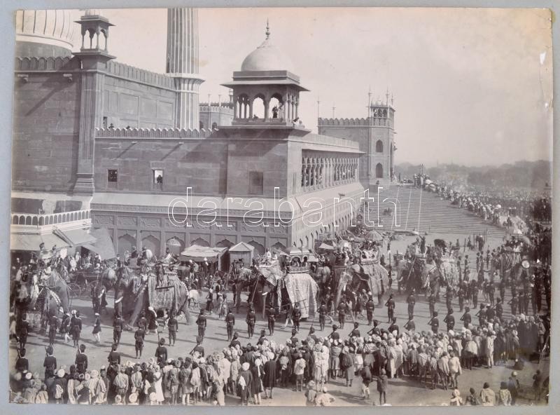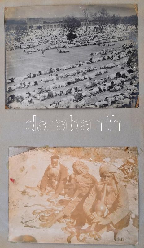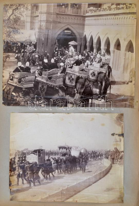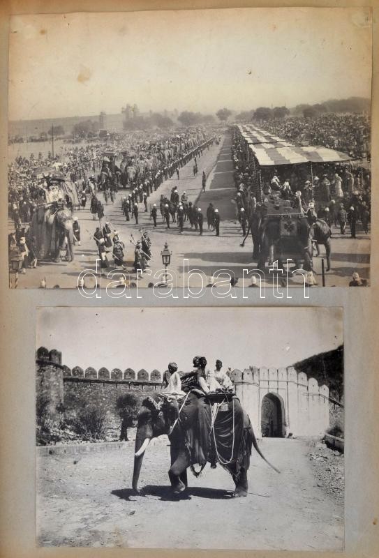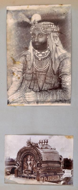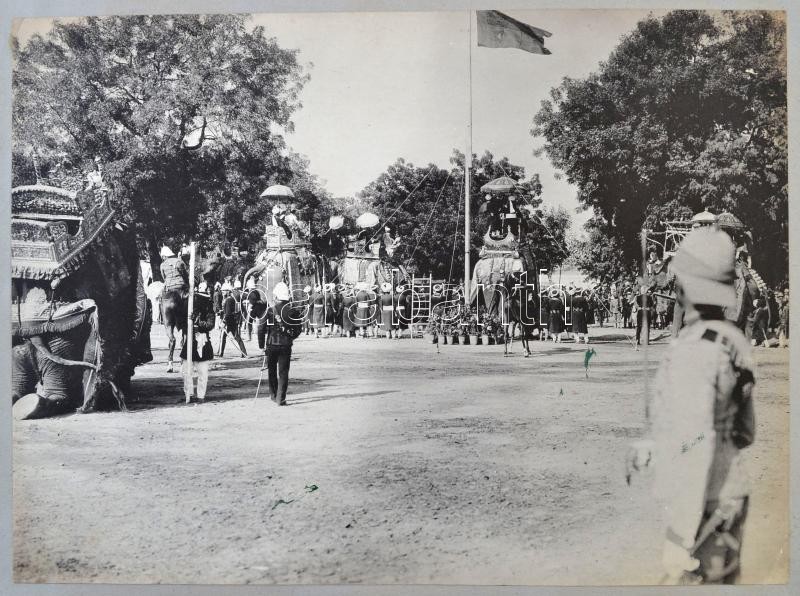 cca 1903 Fantasztikus indiai fotóalbum. 103 db nagyméretű fotó egy ismeretlen magyar indiai utazásáról. Látványosságok és mozgalmas jelenetek vegyesen. Esküvők, vallási és politikai események, maharadzsák, miniszterek. Részben nevesített fotók. Nagyrészt 28x24 cm-esek egy albumba ragasztva. / cca 1903 India. Photo album of a journey. 103 large sized photos of interesting events and sights. Marriages, ceremonies, maharajas (Burdwan and other states, even the Japanese prime minister). Very spectacular collection. Photos are mostly ca 28x24 cm