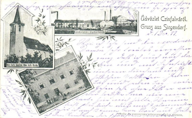 1899 Cinfalva, Siegendorf; Cukorgyár, Római katolikus templom, Tisztviselők háza. Török és Kremsznek kiadása / Zuckerfabrik, Kirche, Beamtenhaus / sugar factory, church, officers' house. Art Nouveau, floral
