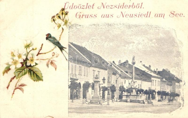 Beschreibung: 1899 Nezsider, Neusiedl am See; Fő tér. virágos, madaras litho / main square / Hauptplatz. Floral, litho