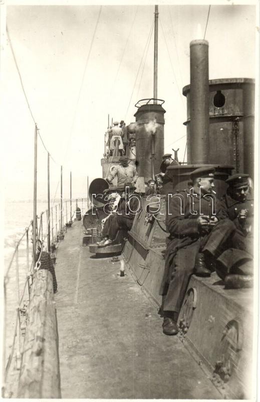 Beschreibung: 1929 Győr őrnaszád (monitorhajó), legénység pihenője a fedélzeten. Dunai Flottilla / Donau-Flottille / Hungarian Danube Fleet river guard ship, mariners resting aboard. photo