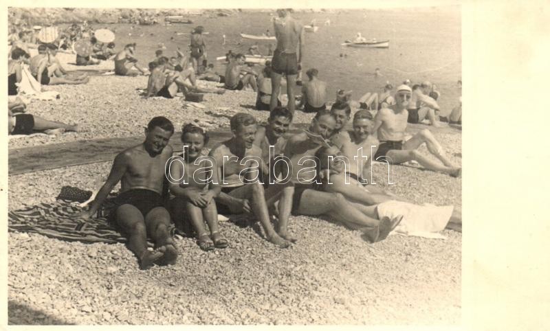 1938 A HMS Warspite Brit Királyi Haditengerészet csatahajójának tisztjei Dubrovnikban a tengerparton, Réthy Anna magyar színésznővel / Naval officers of HMS Warspite of the Royal Navy at the sea in Dubrovnik with Hungarian actress Anna Rethy. photo (Rb)