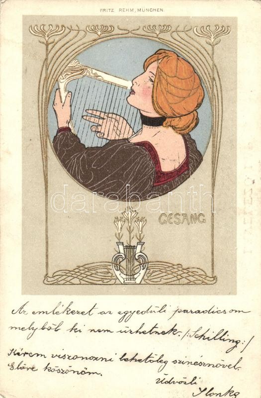 Gesang. Emb. Art Nouveau art postcard. Fritz Rehm, München (EK) https://www.darabanth.com/de/28-Gross-Auktion/28.1/Ansichtskarten/Kunstlerkarten~11372/Gesang-Emb-Art-Nouveau-art-postcard-Fritz-Rehm-Munchen-EK~II1687389