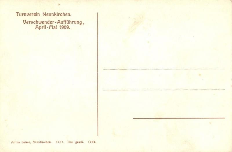 1909 Neunkirchen, Turnverein, Verschwender-Aufführung https://www.darabanth.com/de/28-Gross-Auktion/28.1/Ansichtskarten/Osterreich~11315/1909-Neunkirchen-Turnverein-Verschwender-Auffuhrung~II1647419