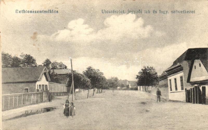 Beschreibung: Betlenszentmiklós, Betelsdorf, Sanmiclaus; Utcakép, Jegyzői lak, Fogyasztási szövetkezet üzlete és saját kiadása / street view, notary's office, cooperative shop