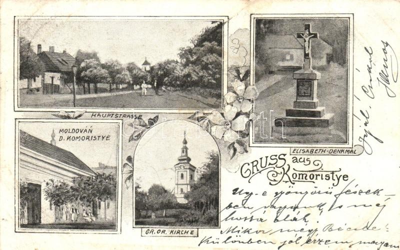 Komornok, Komoristye, Comoraste; Fő utca, Erzsébet emlékmű, templom, moldáv ház / main street, monument, church, Moldovan house, floral Art Nouveau