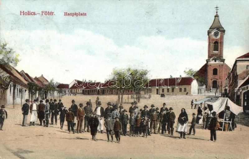Holics, Holic; Fő tér piaci árusokkal, templom. Fischl Richárd kiadása... https://www.darabanth.com/de/28-Gross-Auktion/28.1/Ansichtskarten/Slowakei~11305/Holics-Holic-Fo-ter-piaci-arusokkal-templom-Fischl-Richard-kiadasa-Hauptplatz-main-squa~II1669330
