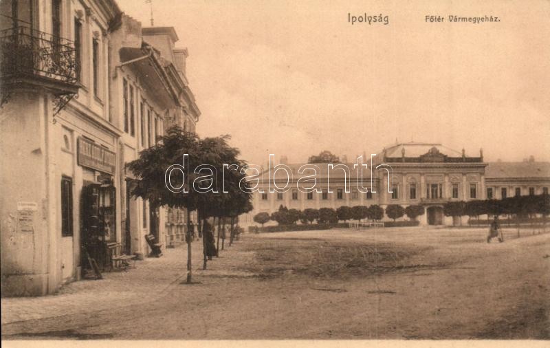 Beschreibung: Ipolyság, Sahy; Herz Adolf utódának üzlete, Fő tér a vármegyeházzal / shop, county hall, main square