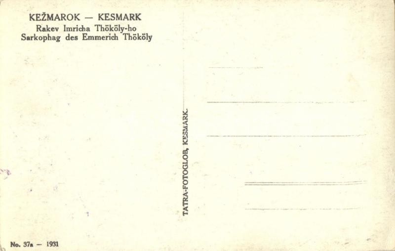 Késmárk, Kezmarok; Thököly Imre megkoszorúzott sírja / wreathed tomb o... https://www.darabanth.com/de/28-Gross-Auktion/28.1/Ansichtskarten/Slowakei~11305/Kesmark-Kezmarok-Thokoly-Imre-megkoszoruzott-sirja-wreathed-tomb-of-Thokoly~II1686850