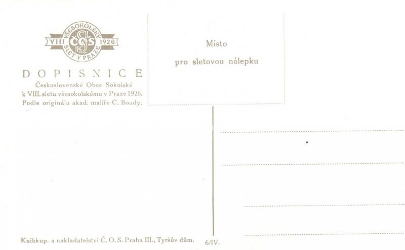 Beschreibung: 1926 VIII. Slet Vsesokolsky v Praze / 8th Sokol meeting in Prague. advertisement card s: C. Boudy