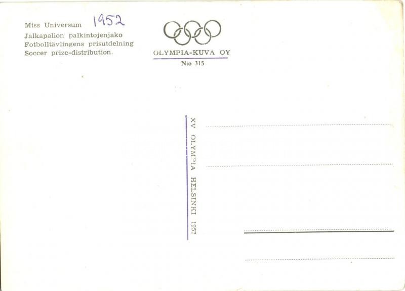 1952 Helsinki Olimpia, Armi Kuusela (Miss Universum) átadja az első helyért járó díjat Grosics Gyulának, Puskás Ferenc / 1952 Helsinki Olympic, Soccer prize distribution for Gyula Grosics (EK)