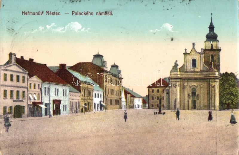 Hermanuv Mestec, Palackého Námesti / square with church https://www.darabanth.com/de/28-Gross-Auktion/28.1/Ansichtskarten/Tschechische-Republik~11322/Hermanuv-Mestec-Palackeho-Namesti-square-with-church~II1647814