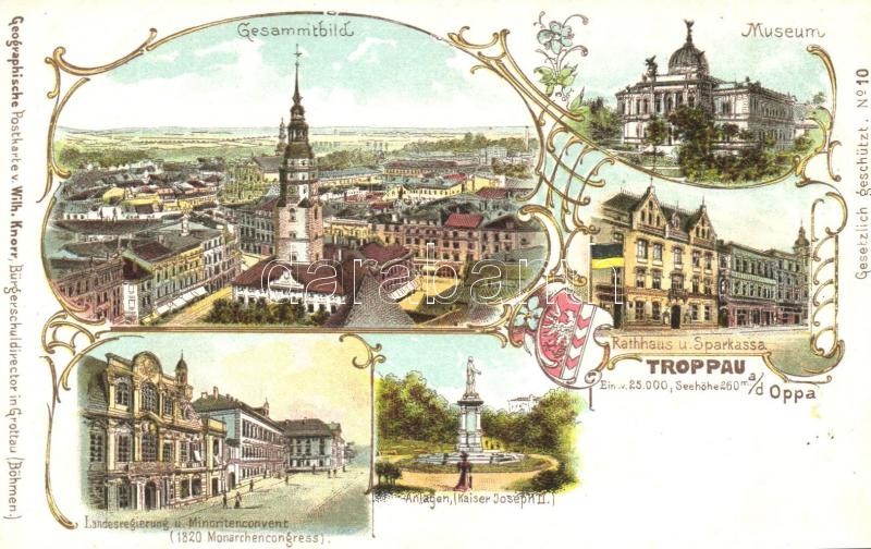 Beschreibung: Opava, Troppau; Museum, Rathaus, Sparkasse, Minoritenconvent. Geographische Postkarte v. Wilhelm Knorr No. 10. Art Nouveau litho