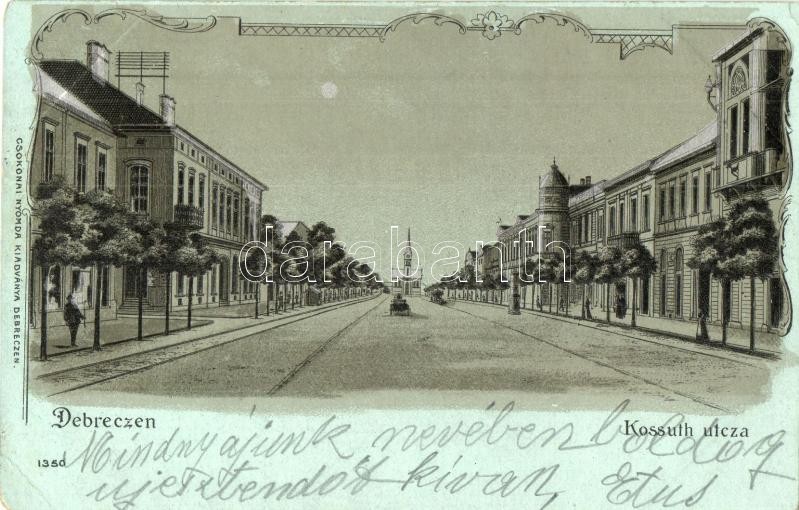 1902 Debrecen, Kossuth utca este. Csokonai Nyomda kiadványa, Art Nouve... https://www.darabanth.com/de/28-Gross-Auktion/28.1/Ansichtskarten/Ungarn~11303/1902-Debrecen-Kossuth-utca-este-Csokonai-Nyomda-kiadvanya-Art-Nouveau-litho-EK~II1669734