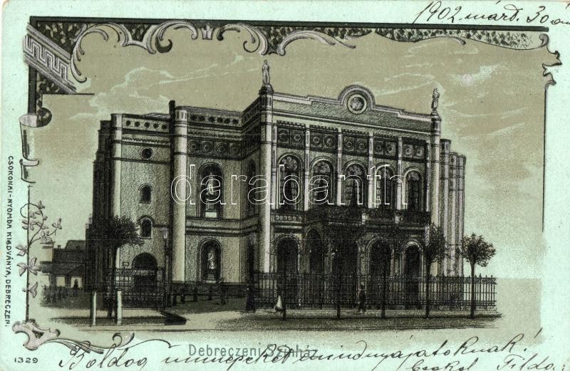 1902 Debrecen, Színház este. Csokonai Nyomda kiadványa, Art Nouveau li... https://www.darabanth.com/de/28-Gross-Auktion/28.1/Ansichtskarten/Ungarn~11303/1902-Debrecen-Szinhaz-este-Csokonai-Nyomda-kiadvanya-Art-Nouveau-litho~II1669736