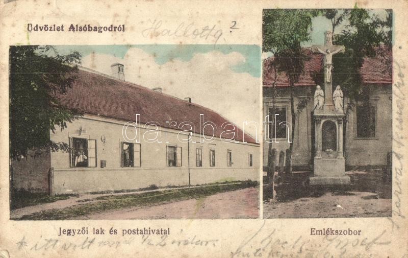 Beschreibung: Alsóbagod, Jegyzői lak és postahivatal, emlékszobor; Özv. Horváth Istvánné kiadása (EK)