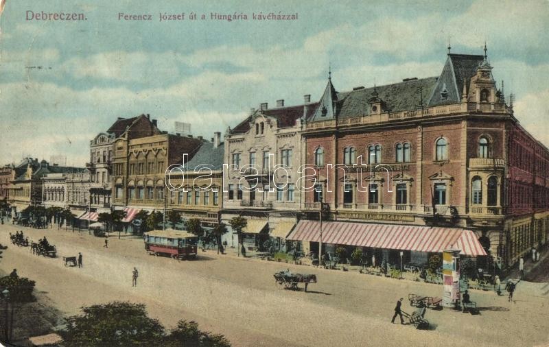 Debrecen, Ferenc József út, Hungária kávéház, villamos https://www.darabanth.com/de/28-Gross-Auktion/28.1/Ansichtskarten/Ungarn~11303/Debrecen-Ferenc-Jozsef-ut-Hungaria-kavehaz-villamos~II1669163