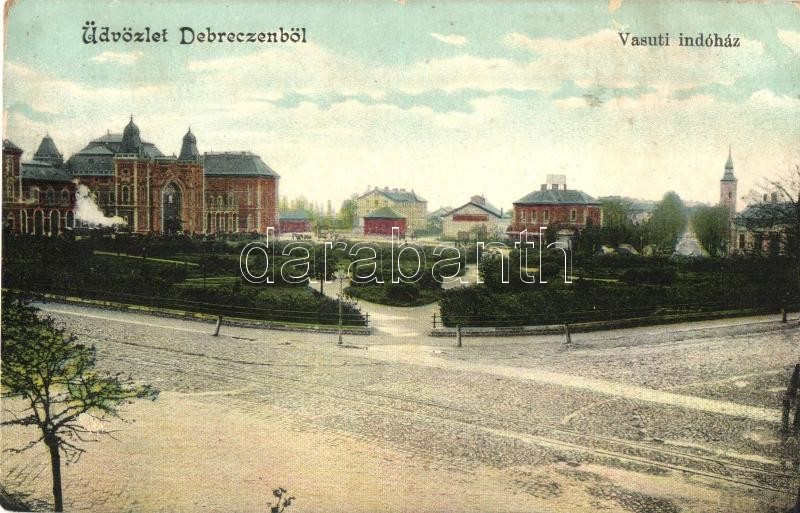 Debrecen, Vasúti indóház, vasútállomás, tér (Rb) https://www.darabanth.com/de/28-Gross-Auktion/28.1/Ansichtskarten/Ungarn~11303/Debrecen-Vasuti-indohaz-vasutallomas-ter-Rb~II1669160