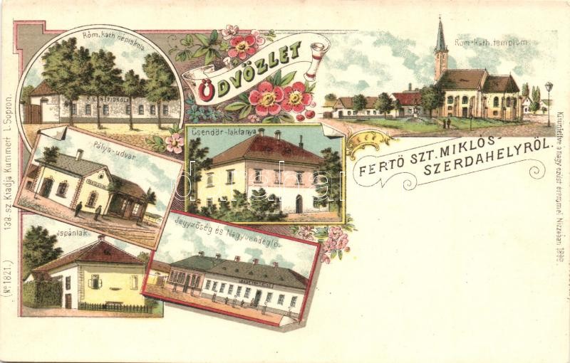 Fertőszentmiklós-Szerdahely, Római katolikus népiskola és templom, csendőr laktanya, vasútállomás, Ispánlak, jegyzőség, nagyvendéglő. Kummert L. No. 1821. Floral, Art Nouveau, litho (Rb)