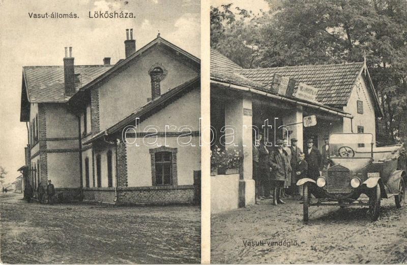 Beschreibung: Lőkösháza, Vasútállomás és Vasúti vendéglő, automobil. Molnár Béla kiadása (EK)
