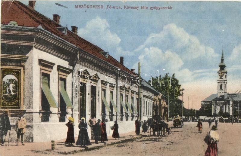 Mezőkövesd, Fő utca, Kövessy-féle Őrangyal gyógyszertár, templom (fl) https://www.darabanth.com/de/28-Gross-Auktion/28.1/Ansichtskarten/Ungarn~11303/Mezokovesd-Fo-utca-Kovessy-fele-Orangyal-gyogyszertar-templom-fl~II1647660
