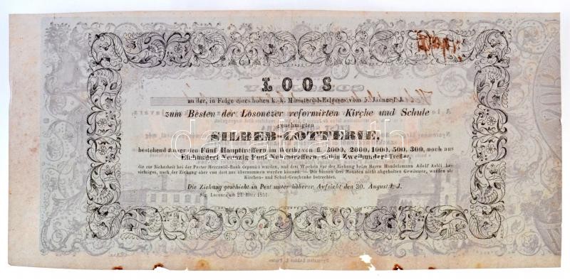 Losonc 1851. "Sorsjegy - A losonczi helvét hitvallású evangelikus Egyház és Iskola javára" 30kr értékben, kézi sorszámmal T:III- szakadás, ly., anyaghiány, szép papír / Hungary / Lucenec 1851. "Lottery Ticket for the benefit of the Lucenec Helvetian Creed Church and School" in worth of 30 Kreuzer, with handwritten serial C:VG tear, hole, nice paper