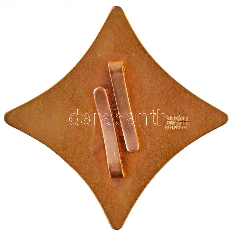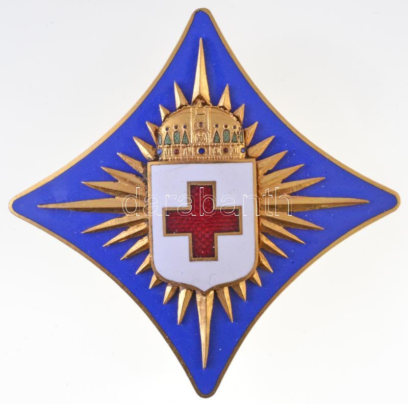 ~1942. "A Magyar Vöröskereszt Díszjelvénye" aranyozott, zománcozott Br kitüntetés, hátoldalon "BERÁN N. BUDAPEST DÖBRENTEI U. 2." gyártói jelzéssel (64x64mm) T:1,1- / Hungary ~1942. "Hungarian Red Cross Award Badge" gilt, enamelled Br decoration, on the backside "BERÁN N. BUDAPEST DÖBRENTEI U. 2." makers mark (64x64mm) C:UNC,AU