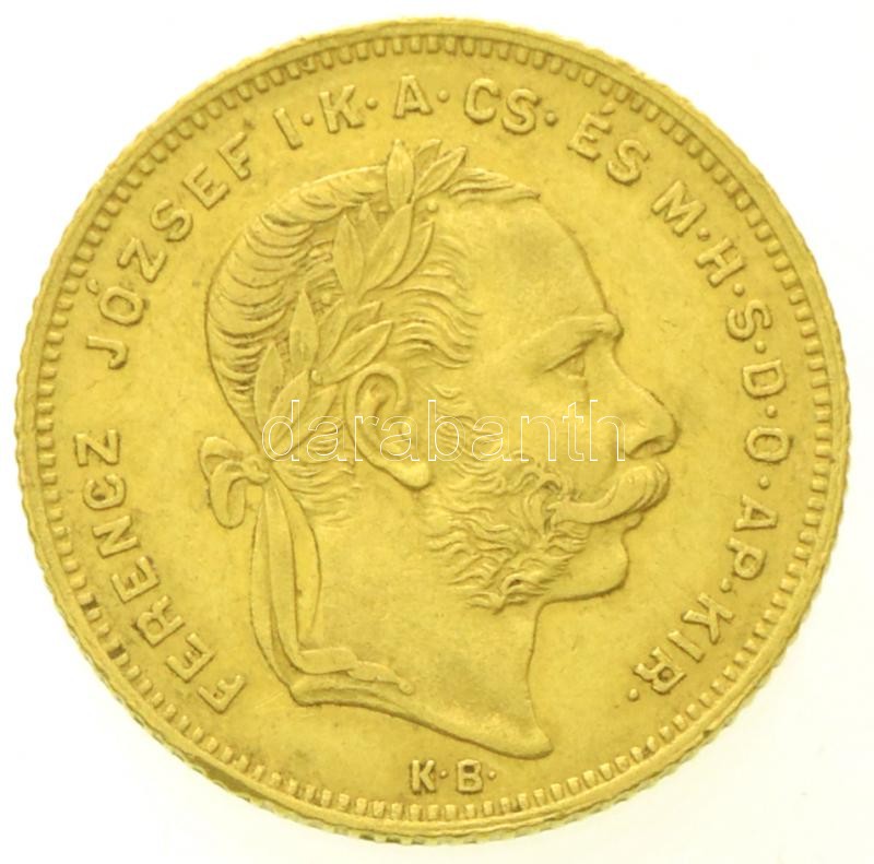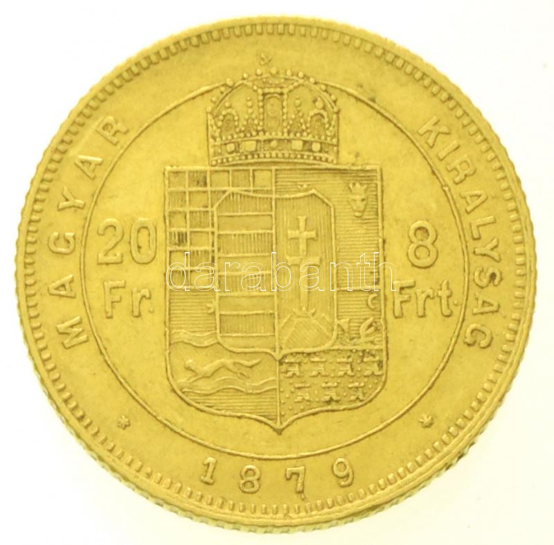 1879KB 8Ft/20Fr Au "Ferenc József / Középcímer" Körmöcbánya (6,43g/0.900) T:2 / Hungary 1879KB 8 Forint/20 Francs Au "Franz Joseph / Coat of Arms" Kremnitz (6,43g/0.900) C:XF Adamo M23