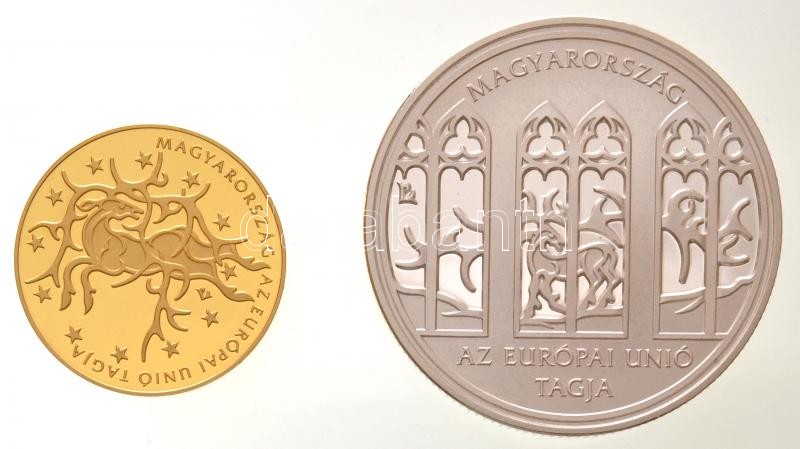 2004. 50.000Ft Au "Magyarország az Európai Unió tagja" tanúsítvánnyal (13,9g/0.986) + 2004. 5000Ft Ag "Magyarország az Európai Unió tagja" tanúsítvánnyal (31,46g/0.925) a két érme együtt díszdobozban T:PP