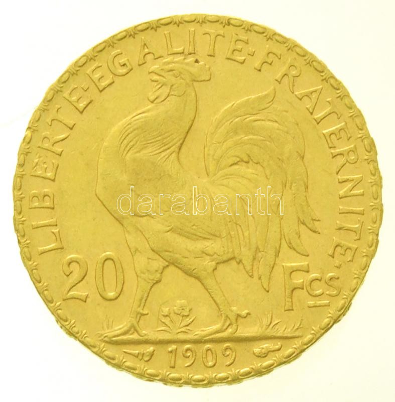 Franciaország 1909. 20Fr Au (6,45g/0.900) T:2 kis karc / France 1909. ... https://www.darabanth.com/de/28-Gross-Auktion/28.1/Numismatik/Goldmunzen-und-Gedenkmunzen~11290/Franciaorszag-1909-20Fr-Au-6-45g0900-T2-kis-karc-France-1909-20-Francs-Au-6-45g0900-C~II1663189